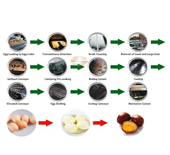 Main functions: egg loading, visual inspection, egg size selection, brush cleaning, pre-cooking and centering, pre-cooking, cooling, shelling, eggshell conveying, cleaning and selection, swing pot high temperature marinating