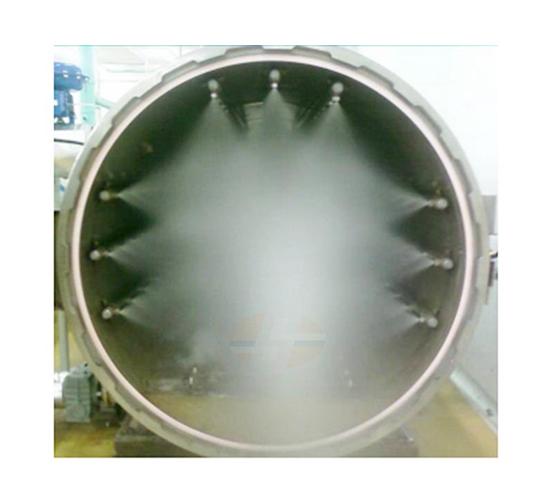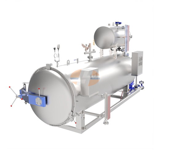 A small amount of process water is injected into the process tank to reach the predetermined liquid level. The process water is evenly sprayed on the product through the nozzles on the top and both sides of the sterilizer via a circulating pump. The heat distribution in the pot is uniform, the temperature and pressure are accurately controlled, and there is no dead angle in the sterilization.