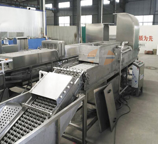 3. Brush cleaning: After the clean water spray is completed, the eggs enter the brush cleaning. The eggs are guaranteed to rotate during the conveying process, and the eggs are brushed all around with the brush. After